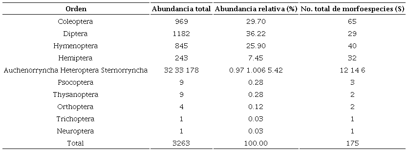Con base en lo anterior y con los resultados reportados, se puede decir que los cinco traspatios compartieron cuatro de los nueve órdenes (Cuadro 3) y que la composición de morfoespecies estuvo representada principalmente por Coleoptera, Diptera, Hemiptera e Hymenoptera. Estos resultados son consistentes con otros estudios, los cuales consideran a Coleoptera, Hymenoptera, Lepidoptera y Diptera como los órdenes megadiversos de la clase Insecta en ecosistemas naturales (Martin-Piera et al., 2000; Gómez-Pamies et al., 2016; Vargas-Batis et al., 2017; Díaz et al., 2018; Téllez et al., 2018), lo cual sugiere que la dominancia de estos órdenes son recurrentes aún en sistemas modificados por el humano como los traspatios.