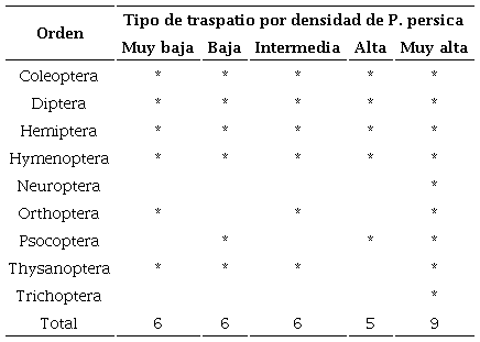 Un total de 3,263 individuos fueron colectados a lo largo del muestreo; estos fueron clasificados en 175 morfoespecies agrupadas en 32 familias de nueve órdenes (Cuadro 2). En términos de riqueza de morfoespecies, Coleoptera fue el orden con más morfoespecies registradas (S= 65), seguida de Hymenoptera (S= 40), Hemiptera (S= 32) y Diptera (S= 29); el resto estuvo repartido en los órdenes restantes [Psocoptera (3), Orthoptera (2), Thysanoptera (2), Neuroptera (1) y Trichoptera (1), ver Cuadro 2]. La mayor riqueza de órdenes se encontró en el traspatio con muy alta densidad de duraznos (Cuadro 3). El traspatio con la más alta abundancia no fue el que tuvo mayor presencia de árboles de durazno, sino el catalogado como de densidad intermedia (1,014 individuos, cobertura de muestreo 64.65 %), seguido del de densidad alta (695 individuos, cobertura de muestreo 76.19 %), muy alta (633 individuos, cobertura de muestreo 66.66 %), muy baja (596 individuos, cobertura de muestreo 68 %) y finalmente baja (325 individuos, cobertura de muestreo 49.3 %) (Fig. 2), sin diferencias significativas para la abundancia promedio de individuos entre los cinco traspatios (F(4,47)= 0.730, P= 0.576) ni en términos de abundancia cuando los datos se analizaron por temporada (lluvias versus seca) (t= 0.922, g.l.= 46, P= 0.361, ver Cuadro 2).