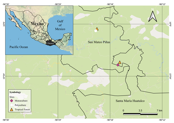 The samplings were carried out in four sites: two coffee agroecosystems with different agronomic management and two sites with tropical forests corresponding to native vegetation. These sites are in La Costa region of Oaxaca, with a subhumid-warm climate (mean annual temperature 23 °C, mean annual rainfall 2,250 mm) (CONANP, 2003). The coffee plantations are 18 km apart and differ in agronomic management. The farm “Loma de Perico” (8 hectares) is in the municipality of San Mateo Piñas (96° 19' 34.2" N, 15° 59' 16.8" W, 829 m.a.s.l.) and has a traditional polyculture system (after Moguel & Toledo, 1999). The shade cover is provided by diverse tree species: Cecropia obtusifolia Bertol. (1840), Bursera simaruba (L.) Sarg. (1890), Inga spp., Ficus tecolutensis (Liebm.) Miq., Anonona muricata L. (1753), Musa spp., Citrus sinensis (L.) Osbeck, Theobroma cacao L.) and Manguifera sp. The second site is in the farm “La Aurora” (50 hectares), in the municipality of Santa María Huatulco (96° 17' 00.1" N, 15° 55' 26.4" W, 1,050 m.a.s.l.), and is a shaded monoculture system (after Moguel & Toledo, 1999). Leguminous shade trees (Inga spp.) provide shade for coffee plants and occasionally Ceiba pentandra (L.) Gaertn. (1791). Both sites have adjacent areas with deciduous tropical forest (after Rzedowski, 1978), 200 m away from the traditional polyculture site, and 350 m away from the shaded monoculture site (Fig. 1). The study area has two well-defined seasons: the dry season, from November to April and the rainy season, from May to October (CONANP, 2003).