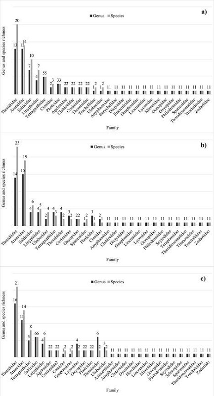 Theridiidae (35 species), Araneidae (25), Salticidae (10), Tetragnathidae (9), Linyphiidae and Thomisidae (8 each) were the families with the highest species richness for the data set. Theridiidae (27 species), Araneidae (20), Salticidae (9) and Thomisidae, Linyphiidae, and Tetragnathidae (7 species each) were the families with the highest species richness in the dry season. Theridiidae (28 species), Araneidae (17), Salticidae (9), Tetragnathidae (8), and Linyphiidae (6) were the families with the highest species richness in the rainy season. Theridiidae (20 species), Araneidae (14), Salticidae (10), Linyphiidae (7), and Tetragnathidae (5) were the families with the highest species richness in the Monoculture (Fig. 2a). Theridiidae (23 species), Araneidae (19), Salticidae (6), and Linyphiidae (5) were the families with the highest species richness in the Polyculture (Fig. 2b). Theridiidae (21 species), Araneidae (14), Tetragnathidae (8), Linyphiidae, and Salticidae (6 species each) were the families with the highest species richness in the Tropical Forest (Fig. 2c).