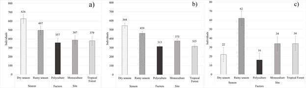 Generalized Linear Model showed that the spiders’ abundance was significantly lower in the rainy season with the manual collection method (Fig. 3a), similarly, the Tropical Forest, the Polyculture site, and the rainy season showed a lower abundance of spiders with the foliage beating method (Fig. 3b); on the contrary, the abundance of spiders was higher in the rainy season but lowest for the Polyculture with the pitfall traps (Fig. 3c; Table 3).