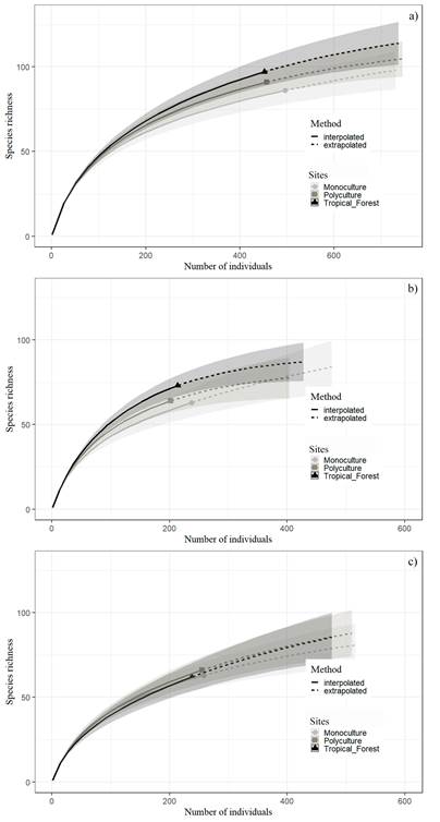 The Chao 1 estimator yielded 116 species for the Polyculture site, 126 species for the Monoculture site, and 127 species for the Tropical Forest. ACE estimator yielded 123 species for Polyculture, 115 species for Monoculture, and 137 species for the Tropical Forest. Completeness values of the inventories range from 68.25% (Monoculture with Chao 1) to 78.44% (Polyculture with Chao 1). Singletons proportions, all above 30%, were highest in the Tropical Forest and lowest in the Monoculture site (Table 2).