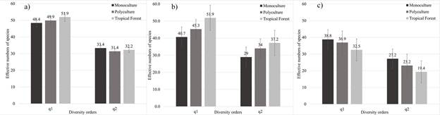 Diversity order q2 indicates that, the site with the highest number of effective species was the Monoculture site with 33.4 equally common species, followed by the Polyculture with 32.2 equally abundant species, and finally the Tropical Forest with 31.4 equally abundant species (Fig. 5a). Tropical Forest was the site with the highest number of effective species in the rainy season with 37.2 equally common species, followed by the Polyculture with 34 equally abundant species, and finally the Monoculture with 28.9 equally abundant species (Fig. 5b). Monoculture was the site with the highest number of effective species in the dry season with 27.2 equally common abundant species, followed by the Polyculture with 23.1 equally common species, and finally the Tropical Forest with 19.3 equally common species (Fig. 5c).