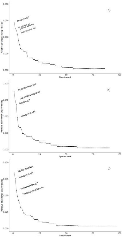 Rank abundance curves show differences in evenness among the sites. Mexigonus sp1, Linyphiidae sp1, Colonus sylvanus (Hentz, 1846) and Philodromidae sp1 (accounting 15.5% of abundance) were the most abundant species in the Monoculture (Fig. 6a). Philodromidae sp1, Neopisinus cognatus (O. Pickard-Cambridge, 1893), Tmarus sp1 and Mexigonus sp1 (accounting 18.5% of abundance) were the most abundant species in the Polyculture (Fig. 6b). Wulfila tantillus, Mexigonus sp1, Philodromidae sp1 and Hentziectypus florens (O. Pickard-Cambridge, 1896) were the most abundant species (accounting 16.4% of total abundance) in the Tropical Forest (Fig. 6c). In this way, the site with the highest evenness was the Monoculture, and the site with the lower evenness was the Polyculture (Fig. 6). For the data set, the most abundant species were Philodromidae sp, Mexigonus sp1, Colonus sylvanus, and Wulfila tantillus.