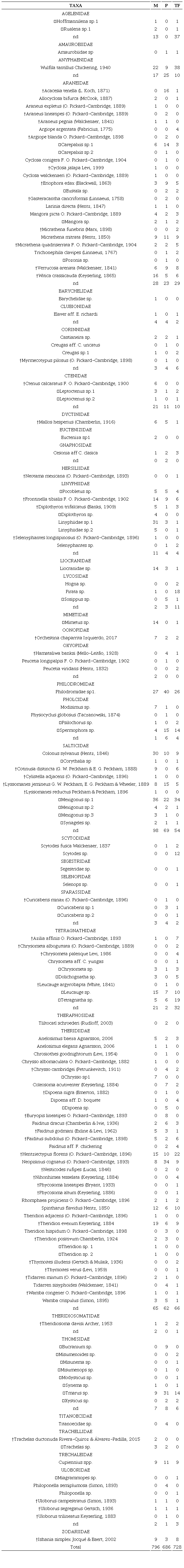 The spiders were identified at the genus level with the keys by Ubick et al. (2017) and at the species level with specialized literature available in the World Spider Catalog (2022). Juveniles were identified at generic or specific level, when possible, by comparing them with adults, or separated as morphospecies. Some too-young, immature specimens could not be identified below genus or specie level. These specimens were excluded from the diversity analyses, but not from the abundance analyses at family level. Part of the collected specimens were deposited at Colección de Artrópodos Benéficos, Centro Interdisciplinario de Investigación para el Desarrollo Integral Regional (CIIDIR), campus Oaxaca, Instituto Politécnico Nacional, and other specimens were deposited at Colección de Arácnidos del Sureste de México (ECOTAAR), El Colegio de la Frontera Sur, Tapachula, Chiapas, Mexico