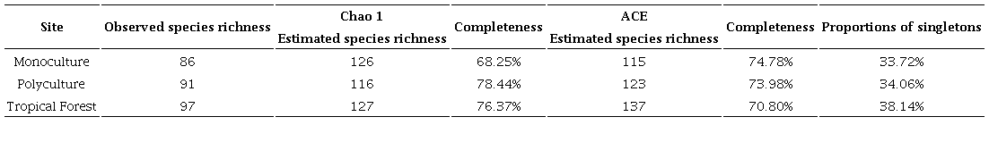 The Chao 1 estimator yielded 116 species for the Polyculture site, 126 species for the Monoculture site, and 127 species for the Tropical Forest. ACE estimator yielded 123 species for Polyculture, 115 species for Monoculture, and 137 species for the Tropical Forest. Completeness values of the inventories range from 68.25% (Monoculture with Chao 1) to 78.44% (Polyculture with Chao 1). Singletons proportions, all above 30%, were highest in the Tropical Forest and lowest in the Monoculture site (Table 2).