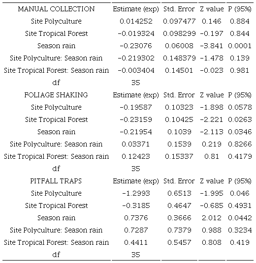 Generalized Linear Model showed that the spiders’ abundance was significantly lower in the rainy season with the manual collection method (Fig. 3a), similarly, the Tropical Forest, the Polyculture site, and the rainy season showed a lower abundance of spiders with the foliage beating method (Fig. 3b); on the contrary, the abundance of spiders was higher in the rainy season but lowest for the Polyculture with the pitfall traps (Fig. 3c; Table 3).
