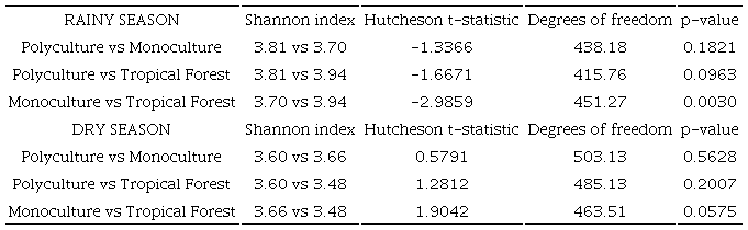Rarefaction curves of observed species richness (order q0) did not show differences between the sites and seasons (Fig. 4). Effective numbers of species for the order q1, indicate that the Tropical Forest had the greatest diversity with 51.9 effective species, followed by the Polyculture with 49.9 effective species, and finally Monoculture with 48.4 effective species (Fig. 5a). Tropical Forest had the highest diversity of species in the rainy season with 51.9 effective species (Fig. 5b), followed by Polyculture with 45.3 and the Monoculture with 40.6 effective species. Monoculture was the site with the highest diversity in the dry season with 38.8 effective species (Fig. 5c), followed by the Polyculture with 36.9 and, finally, the Tropical Forest with 32.5. Unlike the analyses with effective species, the Hutcheson test does detect a significant difference in diversity, i.e., spider diversity was significantly higher in the Tropical Forest than Monoculture in the rainy season (Table 4).