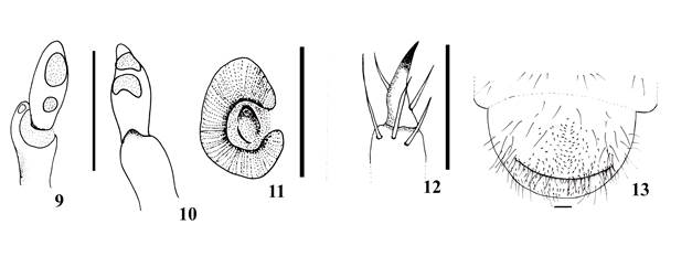 a cada lado; ocelos presentes. Clípeo con 2 sedas centrales y 1 seda lateral a cada lado. Labro asimétrico con los márgenes laterales redondeados, con 4 sedas posteriores, 2 sedas centrales y 3 sedas laterales a cada lado. Epifaringe (Fig. 3) con 2.02-2.10 mm de anchura y 1.28-1.30 mm de longitud, con zygum y epizygum irregular, pardo obscuro; haptomerum ligeramente bidentado, helis ausentes; sin plegmatium; cada acanthoparia con 14-16 sedas espiniformes recurvadas; proplegmatia, proplegmatium y dexiophoba ausente; dexiotorma casi recta y larga, con un extremo redondeado; laeotorma corta; haptolachus sin microsensilas y un cono sensorial redondeado; placa esclerosada grande y angulosa; crepis no diferenciado; chaetoparia izquierda 5-7 sedas gruesas y 80-83 sedas delgadas; chaetoparia derecha 14-17 sedas gruesas y 43-47 sedas delgadas. Mandíbula derecha (Fig. 4) con un área sensorial y 3 dientes (S1, S2, y S3), S3 separado de S2 por una escotadura incisiva; área molar con 2 lóbulos bien desarrollados (M1-2), el lóbulo distal M1 poco desarrollado; calx prominente y brustia moderadamente setosa, con área estriduladora en vista ventral formada por 11 hileras estrechas y 5 sedas en la región dorso-molar. Mandíbula izquierda (Fig. 5) con 1 área sensorial y 4 dientes (S1, S2, S3 y S4), S3 separado de S2 por una escotadura incisiva, lóbulo distal (M1) bien desarrollado; brustia moderadamente setosa; con área estriduladora en vista ventral formada por 12 hileras estrechas y 8 sedas en la región dorso-molar. Maxilas (Figs. 6-7) con 1 uncus terminal en la galea y 3 unci alineados en la lacinia, con 3-4 heli a cada lado; palpos maxilares con 4 palpómeros, el último palpómero el doble de largo que el segundo; área estriduladora maxilar con 9 dientecillos, carente de proceso anterior. Escleroma hipofaríngeo (Fig. 8) asimétrico con el lado derecho reducido y el izquierdo prominente, el lóbulo izquierdo con una fila de sedas delgadas, 9 sedas largas y 6 sedas cortas, el lóbulo derecho con 6 sedas largas. Último artejo antenal con 2 áreas sensoriales ovaladas en vista dorsal (Fig. 9) y 2 áreas sensoriales arriñonadas en vista ventral (Fig. 10). Tórax. Espiráculos protorácicos (Fig. 11) miden 0.48 mm de ancho por 0.75-0.78 mm de largo; placa respiratoria amarillo rojiza, uniformemente recurvadas en forma de “C”, la distancia entre los lóbulos de la placa respiratoria es menor que el diámetro dorso ventral de la bulla redondeada. Pronotum con un escleroma lateral alargado a cada lado, amarillo cremoso, con 26 sedas largas y 14 sedas cortas distribuidas de forma irregular. mesonotum con 31 sedas largas y 23 sedas cortas en hilera transversal; metanotum con 14 sedas largas y 24 sedas cortas en hilera. Uñas pro, meso y metatorácicas iguales en longitud (0.70 mm), con 1 seda prebasal interna y 1 lateral externa (Fig. 12). Las patas aumentan gradualmente en longitud del primer al tercer par. Coxa, trocánter, fémur y tibia con escasas sedas alargadas. Abdomen. Placas respiratorias amarillo rojizas, regularmente recurvada en forma de “C”, estigma del segmento I con un diámetro de 0,30-0,33 mm de ancho por 0.45-0.50 mm de largo; estigmas de los segmentos II a V semejantes en diámetro, 0.40-0.43 mm de ancho por 0.55-0.57 mm de largo; estigmas de los segmentos VI y VII semejantes en diámetro, 0.45-0.47 mm de ancho por 0.50-0.53 mm de largo; estigma del segmento VIII con un diámetro, 0.38-0.40 mm de ancho por 0.40-0.43 mm de largo. Dorsa de los segmentos abdominales I-VII con numerosas sedas espiniformes y pocas sedas largas distribuidas transversalmente, segmento VIII y IX con algunas sedas largas transversales, sin sedas espiniformes. Venter de los segmentos de I al IX con 7-12 sedas medianas y largas distribuidas transversalmente. Raster (Fig. 13), septula no definida, con 75-83 tegs espiniformes más o menos triangulares. Palidia ausente, campus con 6 sedas largas y finas; barbula con 9-11 sedas largas. Labio anal dorsal con 31-35 sedas largas hamate, con numerosas sedas espiniformes cortas; labio anal ventral con 14-16 sedas largas y 9-11 sedas cortas espiniformes; abertura anal transversal, moderadamente recurvada.
