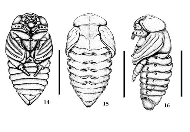 Cabeza. Glabra, fuertemente inclinada hacia abajo, frente con depresiones irregulares, clípeo convexo, labro poco notable, piezas bucales claramente diferenciadas, ojos hundidos, tecae antenales engrosadas. Tórax. Pronoto convexo, meso y metanoto bien diferenciados, pterotheca cerca del cuerpo, curvado ventralmente, extendiéndose posteriormente al segundo segmento abdominal, protibias y mesotibias ligeramente más largas que los mesotarsos, metatibias más largas que los tarsos respectivos. Abdomen. Segmento I ligeramente menos ancho que los segmentos del II-V y claramente más anchos que los segmentos distales, con 5 pares de órganos dioneiformes bien definidos y esclerosados entre el dorso de los segmentos I-V. Estigma respiratorio del primer segmento no visible, cubierto por la base de las tecae alares. Estigmas de los segmentos II-IV con peritremas esclerosados muy prominentes. Estigmas de los segmentos V-VII cerrados, reducidos y rodeados de arrugas finas; el estigma VIII ligeramente visible, con pocas arrugas finas. Segmento abdominal IX triangular, lateralmente extendido y con muesca apical en vista ventral; cada lado de la muesca apical cubierto con un penacho de sedas amarillentas, cortas y delgadas que no se extienden ventralmente, lateralmente, o dorsalmente, sin urogomphi. con un ámpula genital poco prominente en la hembra y muy notable en los machos.