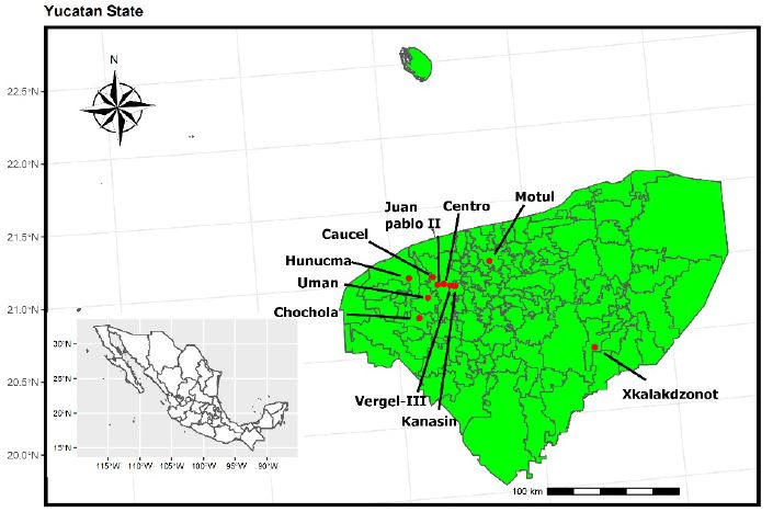 The study was conducted in the state of Yucatán in southern Mexico and included five urban and five rural areas located inside and outside of the state capital, Mérida (population ~1 million). Mérida has a tropical climate with average daytime temperatures that range between 29 °C in December and 34 °C in July. The rainy season occurs from May to October, which overlaps with the season of greatest abundance of Cx. quinquefasciatus although it is present throughout the year (García-Rejón et al., 2010). The selected study sites were neighborhoods and communities with a high incidence of dengue virus transmission. The presence of mutations associated with resistance to insecticides has been reported, as has the detoxifying activity of enzymes in Ae. aegypti populations (García-Rejón et al., 2018). The urban area included the Vergel-III (East), Center Colony (Center), and Juan Pablo-II (West) neighborhoods, which are located in the city of Mérida, and Umán (southwest), and Kanasin (east), which are part of the metropolitan area of Mérida. The rural areas comprised Hunucma (northwest), Caucel (west), Motul (east), Chochola (southwest) and Xkalakdzonot (east), communities that are located between 9 and 123 km from Mérida (Fig. 1).