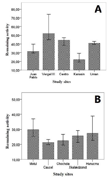 For each study site, 45 individuals were analyzed in duplicate for each plate of AChE and AChEI, resulting in a total of 450 individuals. The results of biochemical tests for AChEI were found to be altered in the sites studied, revealing a significant increase in the activity of acetylcholinesterase in some localities with the presence of propoxur (Fig. 2A and 2B). In the urban area, a significant difference was observed between the percentages of acetylcholinesterase activity in the samples from different sites (KW X2 = 50.65, d.f. = 4, P < 0.001). A greater activity of this enzyme was estimated in mosquitoes collected in Vergel III (53%), Center Colony (45%), and Uman (42%). In the rural areas, a statistically significant difference in the remaining activity of the enzyme was also observed across these sites (KW X2 = 19.72, d.f. = 4, P = 0.001). However, the percentages of AChEI activity measured as a function of its remaining activity also varied in the municipalities of Motul (30%), Hunucma (27%) and Xkalakdzonot (25%) (Table 1).