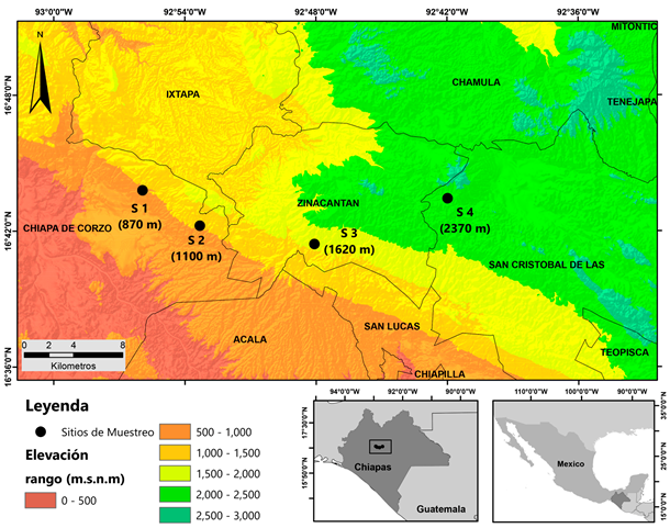 Área de estudio. El muestreo se realizó en un gradiente altitudinal de la región central de Chiapas, México, situado sobre las regiones fisiográficas Depresión Central y Bloque Central. Es una zona extensa con valles intercalados, de fuertes y abruptas pendientes, por arriba de los 1,500 m s.n.m. La vegetación del área está muy perturbada con un bajo porcentaje de la cobertura forestal original. La vegetación original en las zonas bajas se clasifica como selva baja caducifolia (>1,200 m), con remanentes de selva mediana subperennifolia en altitudes superiores a los 800 m y bosques de Pinus y Quercus por encima de los 1,500 m, dominando un género sobre el otro con el incremento de la altitud (Rocha-Loredo et al., 2010; Villalobos-Sánchez, 2013). El clima de las zonas bajas de la región Depresión Central es cálido subhúmedo con lluvias en verano y la temperatura media anual oscila entre 22 y 26°C. El Bloque Central presenta un clima templado subhúmedo con lluvias en verano y una temperatura media anual entre los 12 y 18°C (García, 2004). Para la recolecta de escarabajos se establecieron cuatro sitios de muestreo (S1 - S4) a diferentes altitudes entre los 870 y 2,370 m localizados entre los municipios de Chiapa de Corzo, Zinacantán y San Cristóbal de Las Casas (Fig. 1).