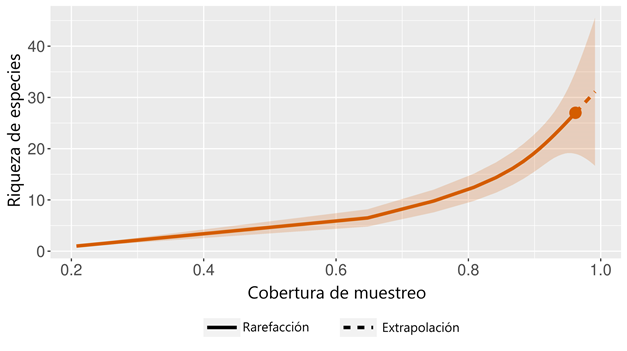 Análisis de datos. La eficiencia del muestreo se evaluó con el análisis de cobertura de muestreo (Ĉm); la cobertura de muestreo mide con exhaustividad el inventario en términos de abundancias de especies observadas, y permite interpolar/extrapolar la riqueza esperada con base en el estimador Chao 1 (Chao & Jost, 2012). Las diversidades se calcularon utilizando las diversidades verdaderas qD (Jost, 2006, 2007). Estas diversidades se calcularon en tres órdenes diferentes de q (0, 1, 2), donde q indica la sensibilidad de la medida de diversidad a la abundancia de las especies. Cuando q es igual a 0, 0D ignora la abundancia de especies y sus valores son iguales a la riqueza de especies. Cuando q es igual a 1, 1D pondera la importancia de las especies en función de sus abundancias proporcionales, y 1D es igual a la exponencial del índice de diversidad de Shannon. Cuando q es igual a 2, 2D sobrepondera la abundancia proporcional de las especies, y 2D equivale a la inversa del índice de dominancia de Simpson (Jost, 2006). Las diversidades verdaderas y las coberturas de muestreo se calcularon utilizando el paquete R iNEXT (Hsieh et al., 2016).