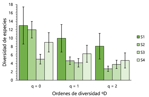 La diversidad de orden 0D muestra una disposición decreciente conforme el incremento de la altitud, pero sólo fue significativamente menor en el sitio 3, mientras que el resto de los sitios exhiben diversidades semejantes de acuerdo con el solapamiento en los intervalos de confianza. Los valores de diversidad 1D y 2D manifiestan un patrón similar, no obstante, únicamente la diversidad del sitio 1, difiere del resto (excepto del S4), los cuales presentan valores parecidos, con un número de especies efectivas abundantes (1D) y dominantes (2D) similares (Fig. 3).