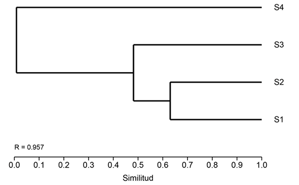 Solo tres especies se capturaron en tres de los cuatro sitios del gradiente, otras seis se compartieron entre dos sitios, mientras que las 18 especies restantes (66.7% de la riqueza total) estuvieron restringidos a uno ellos (S1 = 6, S2 = 4, S3 = 1, y S4 = 7). La composición de especies varió entre los cuatro sitios. El análisis clúster señala un alto porcentaje de similitud entre los dos primeros sitios (63.5%) y disminuye con el incremento de la altitud, donde el sitio localizado a mayor altitud se diferencia totalmente del resto (Fig. 4). La presencia de tres comunidades de escarabajos a lo largo del gradiente fue corroborada por el análisis de diversidad beta, ya que el valor de diversidad obtenido es cercano a tres (Dβ = 2.77).