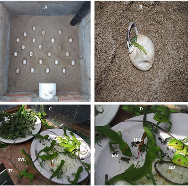 As part of a series of periodic visits to an iguanarium located in Morelos State, México (2 km south of Yautepec at 18° 49' 20" N, 99° 05' 37" W; 1,105 m elev.), we obtained morphometric data on 127 C. pectinata hatchlings (authorization Semarnat No. SGPA/DGVS/03490), produced by 4 females with an average size of 285.3 mm of snout-vent length (SVL) (± 21.5, range: 240.0 - 320.0), average clutch size = 31.1 eggs (±8.6), developed in an environment of tropical deciduous forest and semitropical climate (Fig. 1). To differentiate the sex of hatchlings, the following criteria according to Solorzano and Canales (2009) were considered: males with ovoid-shaped abdominal testicles connected to tubular spermatic cords; females with elongated abdominal ovaries and connected to wavy oviducts. The morphological measurements were obtained from dead individuals that only lived the first week after hatching, and were the following: SVL, tail length (TL), head length (HL, distance in a straight line between the anterior edge of the snout and the anterior edge of the eardrum), head depth (HD, vertical distance in a straight line between the lateral border of the throat and the parietal region), head width (HW, distance between the two edges of the head at the height of the postocular region), forelimb length (FLL, distance obtained by adding the length of the humerus, length of the radius, length of the metacarpus, and length of the phalanges of the longest toe), hindlimb length (HLL, linear distance obtained by adding the length of the femur, length of the tibia, length of the metatarsus, and length of the phalanges of the longest toe) (Hamilton & Sullivan, 2005; Herrel et al., 2007), the weight (g) and the physical robustness (Weight/SVL)*100. All measurements were obtained with a digital vernier (0.01 mm), and the weight was recorded with a scale (precision 0.01 g).