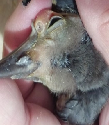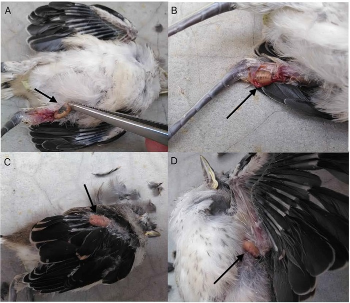 Se encontraron larvas subcutáneas en los tres polluelos de M. gilvus. Para el primer pichón se observó un abultamiento en el ala con un movimiento apreciable en el ala derecha (región radio-cúbito). El polluelo se trató con antibiótico general oral y tópico y sobrevivió.