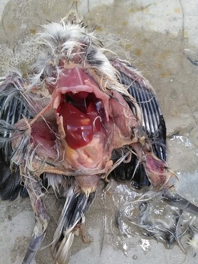 El tercer polluelo mostró un cuadro diarreíco con desnutrición y enfermedad respiratoria aguda, se sacrificó y se extrajo una larva del área de la cloaca. La piel de la cloaca se encontraba rasgada con ligera secreción amarillenta. En la necropsia se encontró baja condición corporal, fragilidad ósea a nivel del costillar, ligera flexibilidad de huesos largos al ejercer presión, masas musculares severamente disminuidas, pálidas, curvatura del esternón evidente, formaciones de rosario en costillas así como hígado friable y congestionado aumento notable de la bolsa de Fabricio y congestión en intestinos (Fig. 2).