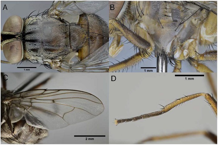 La identificación se realizó utilizando un microscopio Olympus SZ30. Se utilizaron las claves taxonómicas, de Huckett y Vockeroth (1987), Couri (1984)y Couri (1989). Las imágenes fueron realizadas en un estudio para fotografía científica, con la técnica de focus stacking (apilado de imágenes), para ello se empleó una cámara digital Nikon D 800, utilizando diferentes lentes, macro Laowa 100 mm, con magnificación de 1X a 2X, (para las vistas completas de la mosca) y un lente macro Laowa 25 mm, con magnificación de 2.5X a 5X- (para los detalles de las estructuras). Para el apilamiento se utilizó un macro riel automatizado, de la marca Stack Shot. La iluminación utilizada fue con lámparas de leds.