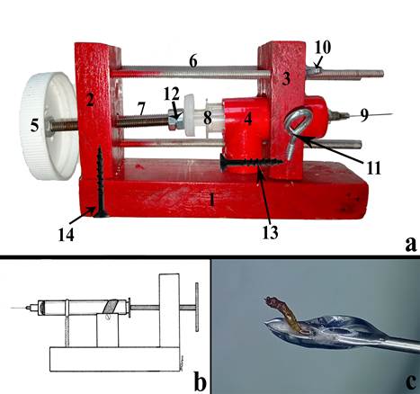 El mecanismo Endo #7 debe estar cargado con la jeringa previamente llena con agua y alcohol proporciones 1:1, se pueden usar otras sustancias como las utilizadas por Fukuda et al. (2015 & 2019). La jeringa se coloca en la pieza de soporte secundario, el tornillo de empuje se debe acoplar a la distancia del émbolo con la cantidad de sustancia a utilizar, se ajusta la armella para fijar la pieza móvil y las palomillas superiores para dar tope, ahora se coloca la aguja en la jeringa. Se debe trabajar observando bajo el microscopio, dando vuelta lentamente a la perilla (de haber fugas se retira la aguja y debe ser sellada de nuevo con cianoacrilato), se recomienda ir girando poco a poco la perilla hasta empezar a ver los pliegues del endofalo, esto puede llevar un par de minutos (si se acelera el proceso puede haber una perforación en el saco interno o que la presión sea tan alta que el edeago sea expulsado con fuerza), el saco interno funciona como una especie de globo, habrá un punto en el que las vejigas de las cuales se componen ya no crecen en tamaño ni en forma y el líquido acumulado por la presión simplemente gotea sin deformar el endofalo, a lo que se debe girar un poco la perilla en sentido contrario a la manecillas del reloj para reducir la presión.