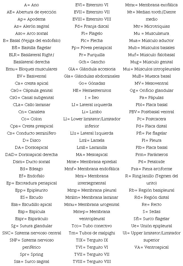 En la terminología empleada se utilizaron abreviaturas estandarizadas, los términos que se proponen como nuevos para Cicindelidae y aplicables a los Carabidae se denotan entre comillas dobles «». En negritas se resaltan las abreviaturas en general. Para los segmentos abdominales se utiliza la numeración romana establecida, pero al referirnos en un mismo párrafo acerca de segmentos correspondientes al zona ventral o dorsal se le coloca un sufijo referente a su posición, Ej.: «Petaloide» = Ptl, Esternito VII = EVII o Terguito VI = TVI.