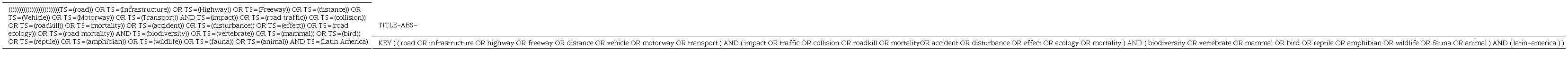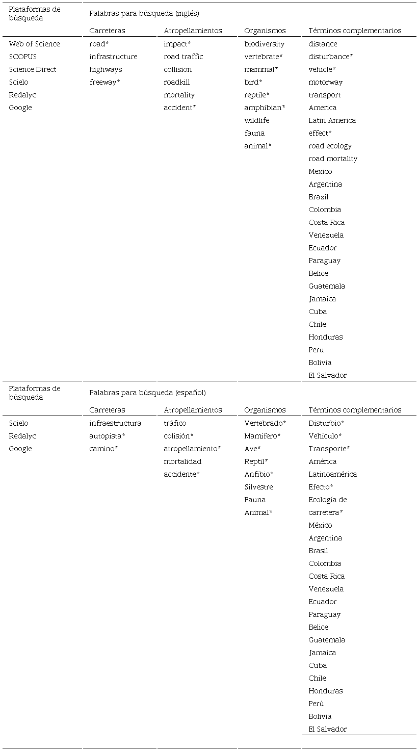 Búsqueda de literatura. El objetivo fue realizar una búsqueda extensiva de literatura en inglés y español de estudios en el área neotropical que cuantificaron cómo la infraestructura carretera afecta la biodiversidad con datos in situ. Se llevaron a cabo búsquedas con palabras clave como “infraestructura” “carreteras” “biodiversidad” “impacto” “colisiones” “atropellamiento”, ya sea en el título o en el resumen (búsqueda completa en Anexo 1), en distintas plataformas (Google Scholar, JSTOR, Science Direct, Scopus, Springer-Link, ISI Web of Knowledge, REDALyC, Scielo, Dialnet y repositorios de tesis digitales). No se limitó la búsqueda por grupos taxonómicos, ni por año de publicación. Otra alternativa para poder encontrar estudios que se encuentran publicados, fue la técnica conocida como “paper trail”, la cual consiste en revisar la bibliografía de los estudios seleccionados, y revisar su bibliografía por estudios relevantes que no aparecen como resultados arrojados por las plataformas de búsqueda.