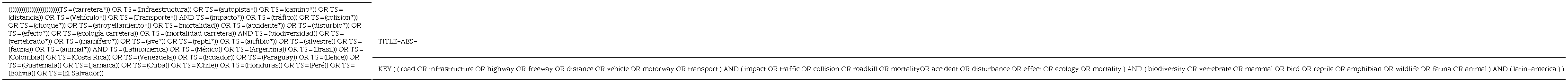 En una revisión del impacto de las carreteras en los vertebrados para el continente africano (Collinson et al., 2019) se encontraron 166 estudios con datos in situ y 14 revisiones de literatura. Para el neotrópico, existen 3 revisiones de literatura, de los cuales dos revisiones sistemáticas que han cubierto 85 (Medrano-Vizcaíno et al., 2022) y 197 publicaciones (Pinto et al., 2020). Sin embargo, no ha sido posible encontrar la misma cantidad de estudios en el presente trabajo, a pesar de que las palabras de búsqueda son más diversas que las reportadas por las otras revisiones sistemáticas. De hecho, ninguna de las dos revisiones existentes cumple con los estándares de cómo reportar la metodología, no se menciona ningún protocolo de reporte como p.ej. PRISMA o ROSES, ni los search strings. En Medrano-Vizcaíno et al. (2022) tampoco se mencionan los repositorios usados. De esta manera, no hay transparencia o certeza sobre la robustez y reproducibilidad de las búsquedas aplicadas para estas revisiones.