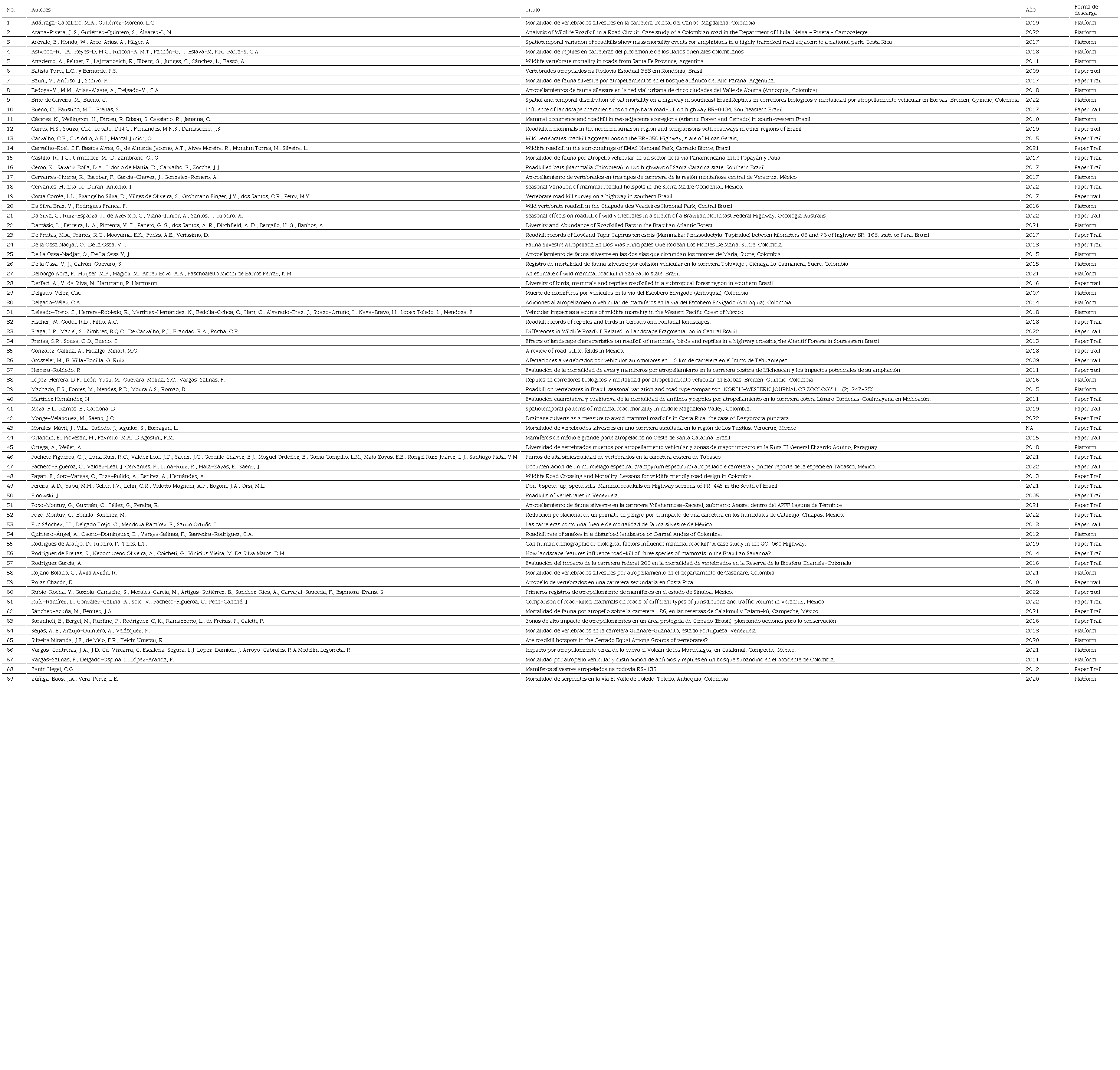 Kolb, M., Cruz-Cano, R., Saldaña-Vázquez, R. A. (2025) Atropellamientos de vertebrados terrestres en carreteras: los vacíos cuantitativos para el neotrópico. Acta Zoológica Mexicana (nueva serie), 41, 1-35