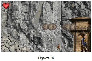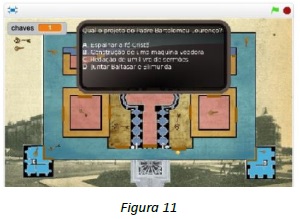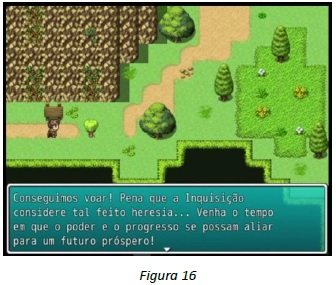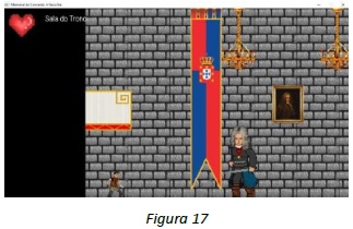 Fiel à tradição dos RPGs, há circunstâncias em que o jogador alterna de personagens, o que ocorre, por exemplo, quando entra no Convento de Mafra e passa a controlar o rei D. João V (Cf. Figura 15), que pode, por exemplo, ir ao quarto da rainha, visitar a biblioteca. Por, outro lado, o típico jogo de aventura/RPG tem normalmente uma narrativa associada e o jogador tem que percorrer determinados espaços e superar obstáculos pré-estabelecidos para a concluir (Cf. Figura 16).