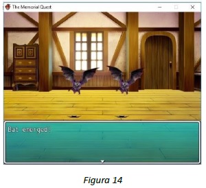 O jogo criado por este grupo, designado por The Memorial Quest, segue as regras dos RPGs: apresenta uma personagem principal, Baltasar, que percorre diversos espaços, colecionando moedas, obtendo o gancho, recolhendo vontades ou respondendo a perguntas do tipo quiz para poder avançar na aventura. Os alunos criaram um mundo que contempla vários dos espaços da obra, com vários NPCs que dão informação sobre os eventos e/ou colocam questões sobre a obra. The Memorial Quest desenvolve-se a partir de um mapa e o jogador pode explorar o interior de várias edificações, nos diferentes lugares a que acede. É uma produção fiel à tradição de RPGs, com um sistema de combate: contra ratazanas em Lisboa e contra morcegos numa monumental biblioteca no Palácio de Mafra. Estas batalhas permitem ganhar moedas e XP (Experience Points), criando uma verdadeira experiência de videojogo (Cf. Figura 14).