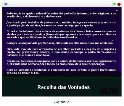 A proposta intitulada Memorial do Convento integra um conjunto de minijogos organizados de acordo com os capítulos do romance, respeitando o conteúdo narrativo de cada um. Dada a extensão da obra, o grupo apresentou apenas 3 jogos concluídos, disponibilizando, contudo, o resumo de cada um dos capítulos do romance (Cf. Figura 7), ao qual se acede clicando no respetivo número ou através da conclusão do desafio proposto. O primeiro jogo traduz, sob a forma de labirinto, o percurso de D. João V até ao quarto de D. Maria Ana Josefa e adapta de forma lúdica o capítulo I. (Cf. Figura 5). Para o capítulo XV, os alunos conceberam um jogo em que as vontades (um dos elementos simbólicos mais explorado na obra e motor da narrativa) tombam do céu e o jogador tem de as capturar num frasco transparente, o que tem correspondência com a ação do romance, equivalendo à sequência narrativa em que Blimunda tem de recolher duas mil vontades (Cf. Figura 6).