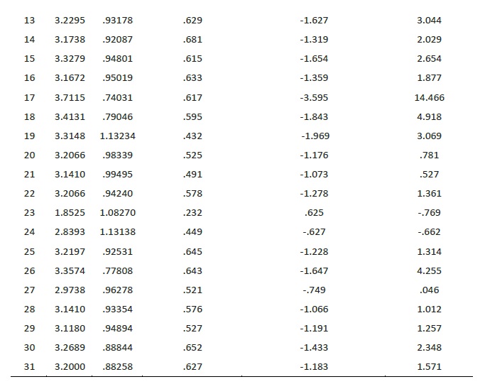 El análisis de las propiedades de los ítems permitió seleccionar los ítems más apropiados e identificar aquellos que no presentaban garantías psicométricas y que convenía eliminar siguiendo los siguientes criterios: índices de asimetría y curtosis adecuados, carga factorial suficiente, y correlación (Pearson) ítem-escala significativa.
