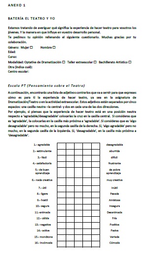 Los ítems seleccionados formaron parte de la versión piloto de la batería “El Teatro y yo”, que quedó compuesta por: 1) La escala PT, una prueba de diferencial semántico en la que los sujetos deben responder a una lista de adjetivos presentados de forma bipolar (i.e., agradable, desagradable) y tres estados intermedios. El sujeto debe ubicar en dicha escala su pensamiento sobre qué significa hacer teatro en relación con cada uno de los pares de adjetivos. La versión piloto de esta escala estaba compuesta por 20 pares de adjetivos. 2) La escala VET evalúa las creencias implícitas que los sujetos tienen respecto a la experiencia de participar en las clases, talleres o en el montaje y representación de una obra teatral. Se trata de una escala tipo Likert, formada por 33 ítems, en la que los sujetos contestan según su grado de conformidad. Y finalmente, la escala IET formada por 12 ítems que se refieren a las percepciones que los estudiantes de teatro tienen en torno al impacto y la huella que les ha dejado la experiencia teatral. Se trata también de una escala tipo Likert.