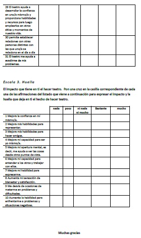 Por separado las tres escalas nos sirven para explorar qué significa el teatro para los jóvenes que lo practican, como valoran la propia experiencia de hacer teatro y el reconocimiento del impacto que su práctica produce en ellos. En conjunto, los tres instrumentos que forman la batería ofrecen la posibilidad de realizar una radiografía relativamente completa sobre las percepciones subjetivas de los jóvenes respecto a su implicación en la práctica teatral.