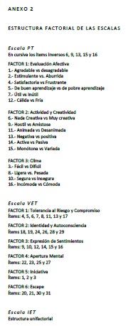 Aplicando estos criterios fueron eliminados cuatro pares de adjetivos de la prueba piloto PT, dos ítems de la prueba VET y otros dos de la prueba IET. El Análisis Factorial con rotación Oblimin permitió identificar una estructura de tres factores para la prueba PT, seis para la prueba VET y uno para la prueba IET.