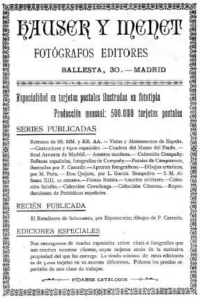 Hauser & Menet, which produced 40% of the picture postcards printed in Spain in the nineteenth century, and which in 1892 sold just 200, had by 1902 amassed a collection of 1,300 different cards and a production that never dropped below 500,000 a month. By the turn of the century there were nearly 150 printing houses in Spain, or abroad but with postcards referring to Spain, that were printing, publishing and selling picture postcards, some of which were not for public use. An outstanding example from 1905 in Barcelona was Ángel Toldrá Viazo (A.T.V.) (Boix, 2002). From 1906 to 1915 this technologically state-of-the-art industrial sector had become fully consolidated (Sánchez & Villena, 2010, p. 32; Teixidor, 1999, pp. 15-23). Well known photographers would also become associated. In some cases, for example, that of the Madrid-based Lacoste & Co., this was because they considered themselves the successors of Jean Laurent, the Queen’s photographer from 1861 to 1868, and of his photographic collections which were sold as business cards (Pérez, 2015, pp. 270-290), while in others, like Antonio Cánovas del Castillo (“Kaulak”), it was because of the publication of some of his photographic compositions in the form of postcards with the help of printers like Lacoste & Co. and Hauser & Menet. For example, there was the collection of ten postcards on Las Doloras by the poet Ramón de Campoamor, which sold 180,000 collections, or 1,800,000 postcards in Spain and Latin America (Los editores, 1905, pp. 9-10).