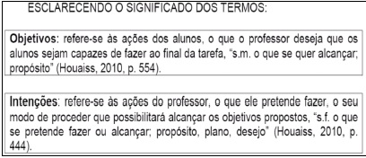 Os itens C, D e E denotam a importância dada pelos docentes em apresentar os objetivos com a THA proposta. Cabe relatar que durante a Oficina de Formação Continuada, os professores sujeitos da pesquisa tiveram a oportunidade de estudar teoricamente noções sobre a THA de Simon (1995) e participaram de seminários e debates coletivos sobre este assunto, na tentativa de encontrar “um lugar comum” para falar sobre a produção delas. Portanto, era de se esperar que os três elementos essenciais da THA fossem apresentados em suas produções. Além disso, observa-se que em algumas trajetórias encontramos os elementos “objetivo geral”, “objetivos específicos” e “intenções”. Um amplo debate havia sido realizado no âmbito dos encontros presenciais da Oficina de Formação Continuada. Essa distinção entre objetivos e intenções pode ser explicitada pelo seguinte excerto presente na produção de T1 (Figura 2).