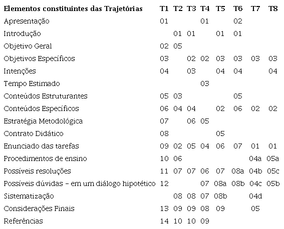 Nas linhas estão dispostos cada um dos elementos distintos que os docentes julgaram importantes de apresentar em suas produções. Nas colunas enumeramos a ordem em que estes elementos aparecem na trajetória no sentido “linear” da leitura, para termos uma ideia das escolhas que eles fizeram, ou, nenhuma marcação quando não são apresentados declaradamente7. Associamos as letras (a, b, c,...) aos números, para indicar os casos nos quais os elementos escolhidos apareceram simultaneamente, por exemplo: 08a e 08b, indicam que os dois elementos citados aparecem juntos, sem uma ordem específica.