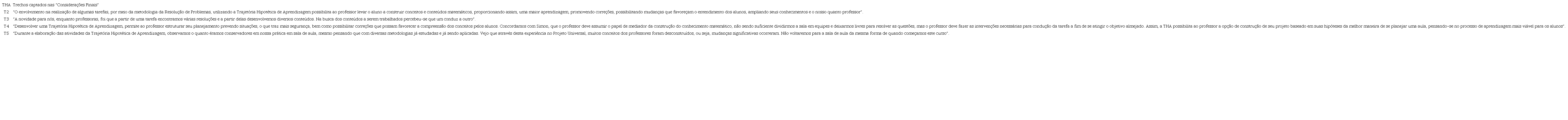 No item P (considerações finais) os professores autores das trajetórias geralmente expressam considerações mais sobre o trabalho desenvolvido no contexto da oficina de formação continuada, do que considerações específicas da trajetória que realizaram em particular. Essas considerações, em geral, foram na direção de: retomar o conceito teórico da THA pelas explicitações de Simon (1995); relatar as dificuldades que tiveram ao longo do processo da elaboração da THA; ressaltar as aprendizagens que tiveram neste processo (fala de T2, no Quadro 3); motivar outros docentes a elaborar THA (fala de T4, no Quadro 3); concluir que as THA se constituem como um recurso “articulador” de ideias; entre outros. No quadro 3 podemos ver alguns trechos que exemplificam essas considerações.