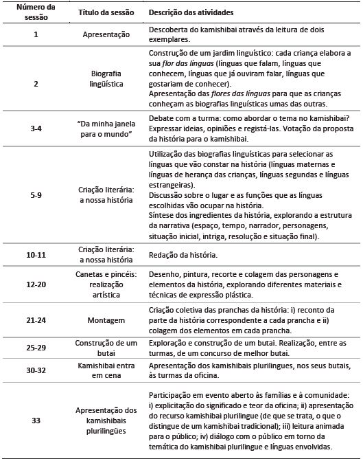 Assim, cada turma participou num total de 33 sessões na oficina “Kamishibai Plurilingue”, com a duração de 60 minutos, uma vez por semana. No quadro 1 abaixo, apresentamos o plano global das sessões da oficina.