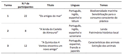 No quadro 2 são apresentados as línguas e os temas trabalhados nos kamishibais plurilingues na oficina de cada turma: