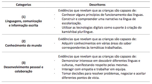 O presente estudo foi norteado pela questão de investigação “quais as potencialidades do kamishibai plurilingue em contexto de educação não formal no desenvolvimento de competências em diferentes domínios?”, tendo sido definidos objetivos investigativos para que fosse possível identificar as competências desenvolvidas pelas crianças. A criação dos kamishibais plurilingues, na oficina, possibilitou o desenvolvimento de competências em variados domínios, contudo, focámos a nossa investigação nos domínios da leitura e da escrita na língua de escolarização e outras línguas (categoria 1), nos conhecimentos do mundo adquiridos (categoria 2) e no desenvolvimento de atitudes de respeito para com as línguas e para com o Outro (categoria 3).