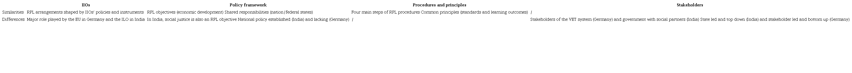 The RPL discourses and policies of IIOs interact with national systems of education and training, which feature shared responsibilities between the federal and state levels in both countries. RPL policies are mainly promoted at the federal level, whereas implementation lies with strong and well-established stakeholders. While RPL is a clearly framed policy in India, Germany lacks a national policy framework and RPL is based more on numerous (project) initiatives. Furthermore, RPL policy in India is state led and top down; the state develops a policy and stakeholders have to follow and implement it. In Germany, on the other hand, RPL arrangements are more stakeholder led and bottom up; policy decisions are usually reached by consensus and negotiated among different stakeholders (cf. Singh, 2015, pp. 160-161).