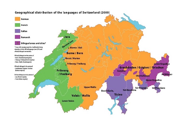 A fronteira territorial entre as línguas francesa e alemã vai do noroeste perto de Basileia até à Itália no sul. A fronteira física entre as línguas italiana e alemã corre ao longo das Montanhas Gotthard e do maciço central dos Alpes suíços. Por fim, o romanche situa-se em vários enclaves no cantão dos Grisões (Fig. 1)