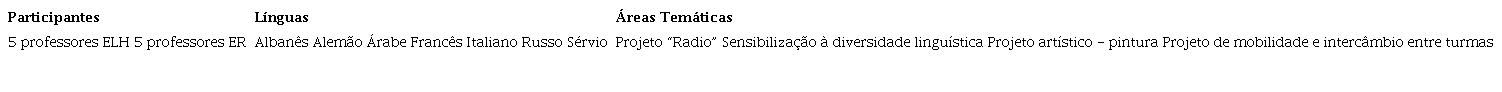 Participaram 5 professores do ER e 5 do ELH de línguas diferentes. Os professores do ELH mostraram-se desde o início muito interessados e colaboraram ativamente na divulgação do projeto para motivar a participação de professores do ER junto dos seus contatos. Os professores do ER que voluntariamente participaram são plurilingues ou nutrem uma paixão pelas línguas, são professores com vinte ou mais anos de experiência de ensino. De referir ainda que alguns dos professores do ER envolvidos neste projeto já tinham participado em pequenos projetos para a promoção das línguas.