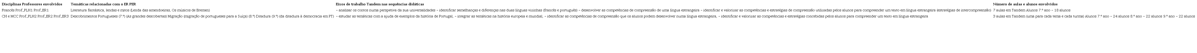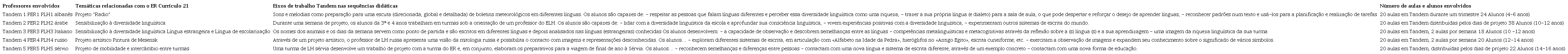 O projeto Tandem na escola (quadro 2) foi desenvolvido numa escola do cantão de Neuchâtel e foi divulgado ao corpo docente da escola pelas professoras proponentes. Estas elaboraram uma listagem de temáticas constantes do PER19 possíveis de abordar em tandem para todas as disciplinas escolares, de modo a possibilitar a participação de todos os professores do ER, uma vez que os docentes do ELH já se tinham disponibilizado para o trabalho colaborativo.