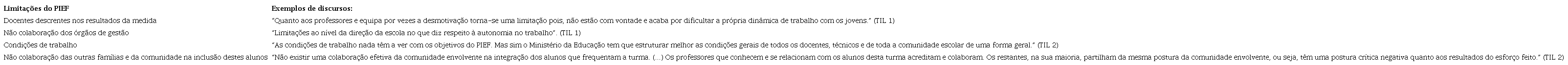 Referem, ainda, que as principais limitações que se colocam à sua intervenção estão, muitas vezes, centradas no nível do trabalho da equipa técnico-pedagógica, em particular na desmotivação dos docentes para trabalhar com estes alunos, da falta de autonomia dos profissionais, na postura de não colaboração por parte dos órgãos de gestão e na não existência de uma colaboração efetiva das famílias e da comunidade envolvente na inclusão destes alunos (tabela 8).