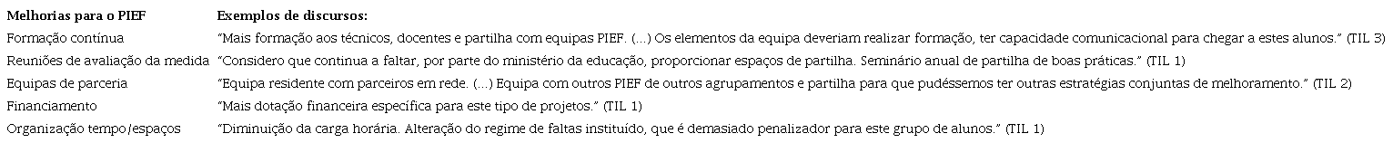 Promover o sucesso para a obtenção de níveis de instrução mais elevados e para uma integração no mercado de trabalho mais qualificada é, na perspetiva destas profissionais, a chave da sua inclusão social. Para que essa finalidade seja cumprida consideram ser necessário que o Ministério da Educação e os agrupamentos de escolas realizem mais formação para os docentes e outros profissionais envolvidos nos diversos PIEF. Referem que o Ministério da Educação deve, ainda, criar eventos para que haja uma partilha de experiências entre as equipas PIEF das escolas e agrupamentos, com vista a identificar boas práticas que permitam melhorar estratégias de ação que tornem as escolas verdadeiramente inclusivas destes alunos, a quem deve ser potenciado um desenvolvimento pleno, harmonioso e integral (tabela 9).