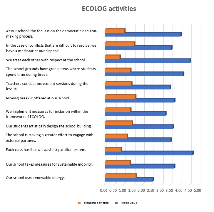 According to model of an effective ESD-School (Verhelst et al., 2020) ECOLOG serves as a shared vision and reflects the school-wide understanding of ESD. Supportive relations provide a way of working together on ESD related issues, but could be fostered. The collective efficacy means the conviction of positive effects of teams. An essential criterion for joining ECOLOG is to build a team in the school so that ESD activities and responsibilities do not rest on the shoulders of a single person (the coordinator).
